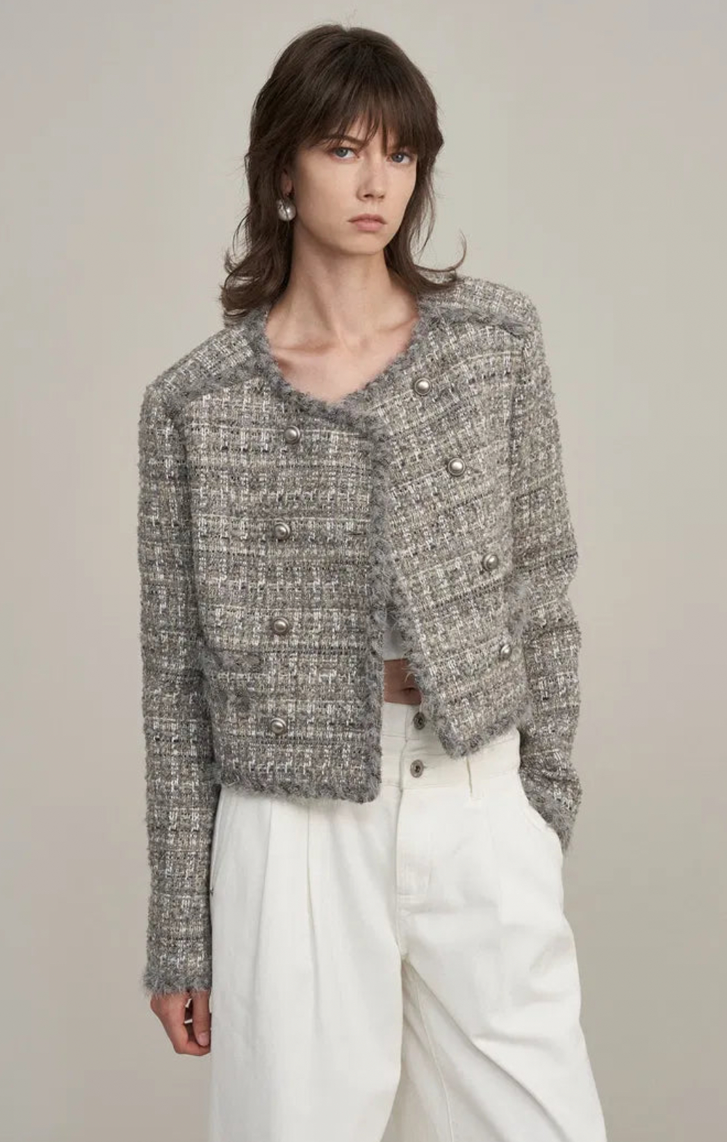 雙排扣花呢小香風外套,打9折+額外85折,這個灰色怎麼仙仙的!但是這件需要預購,我先放入清單,之後有現貨再來考慮~